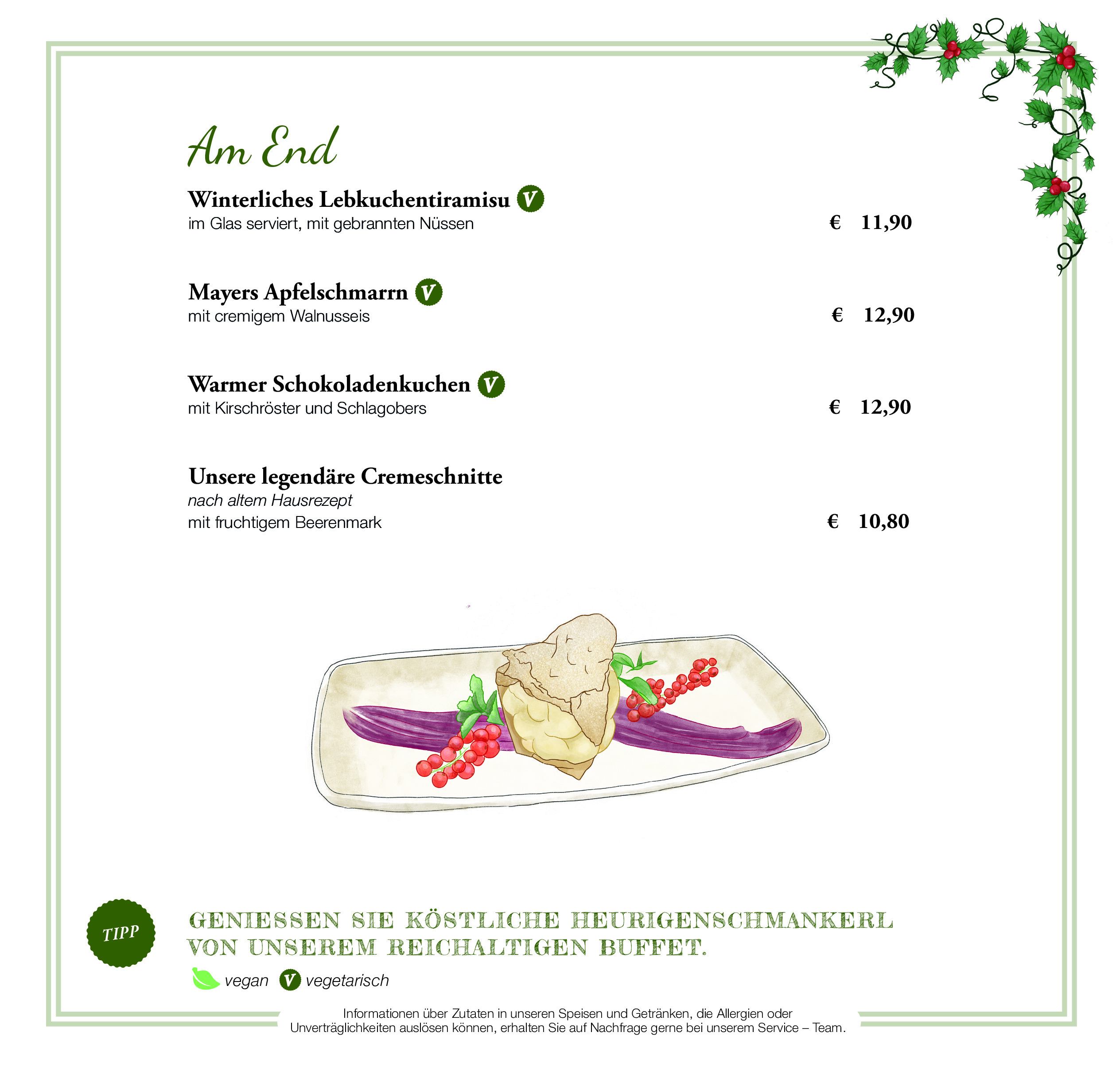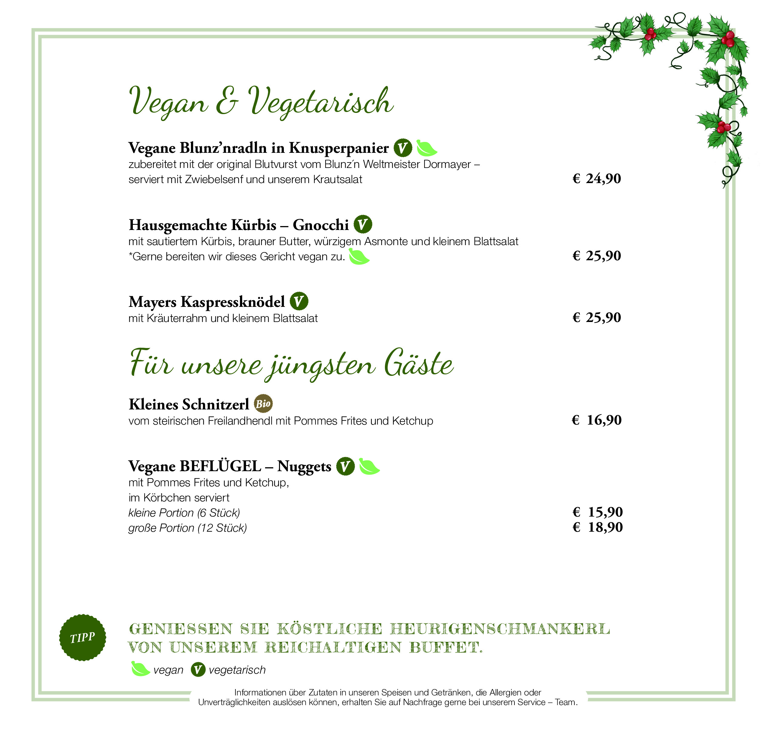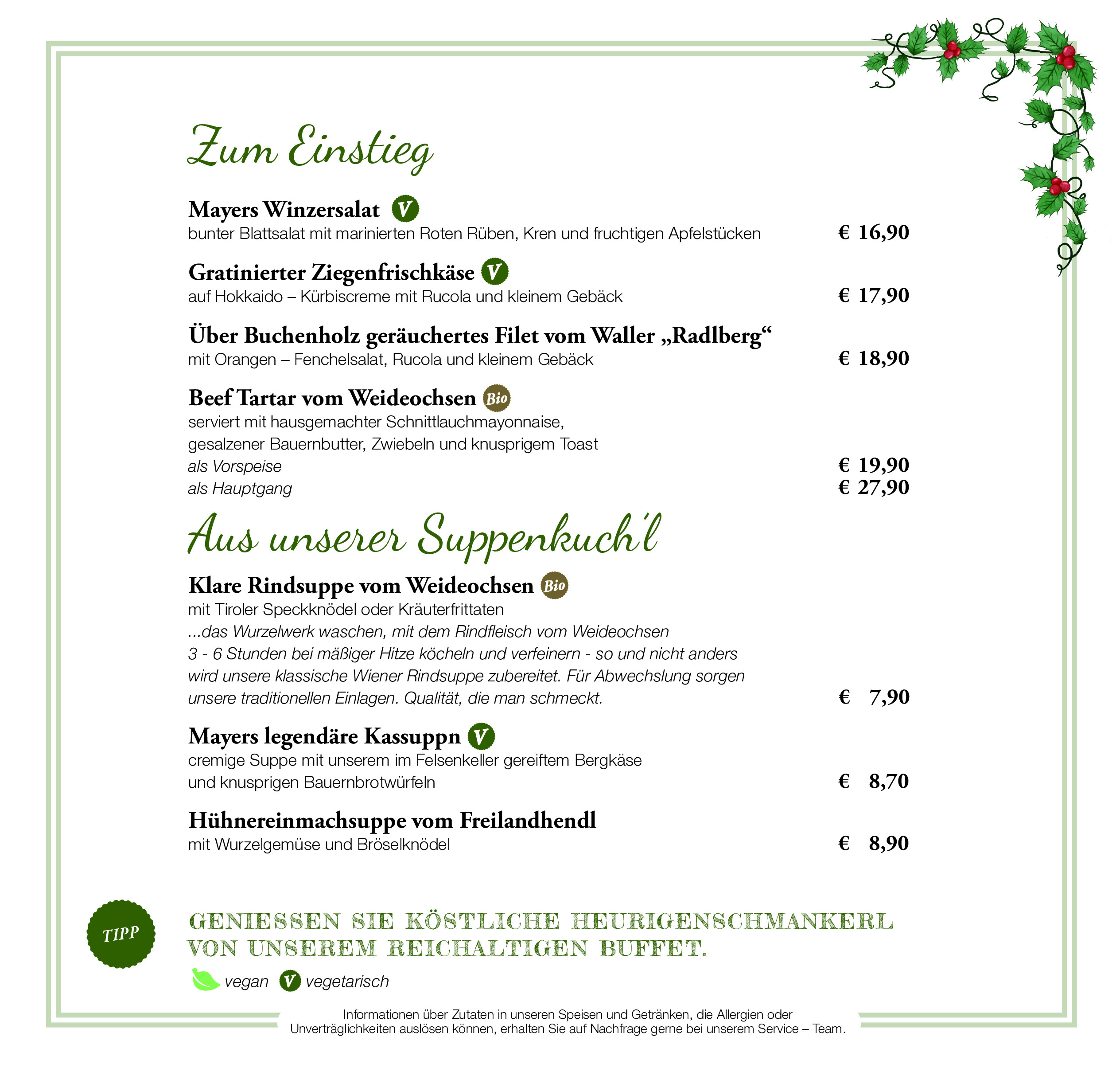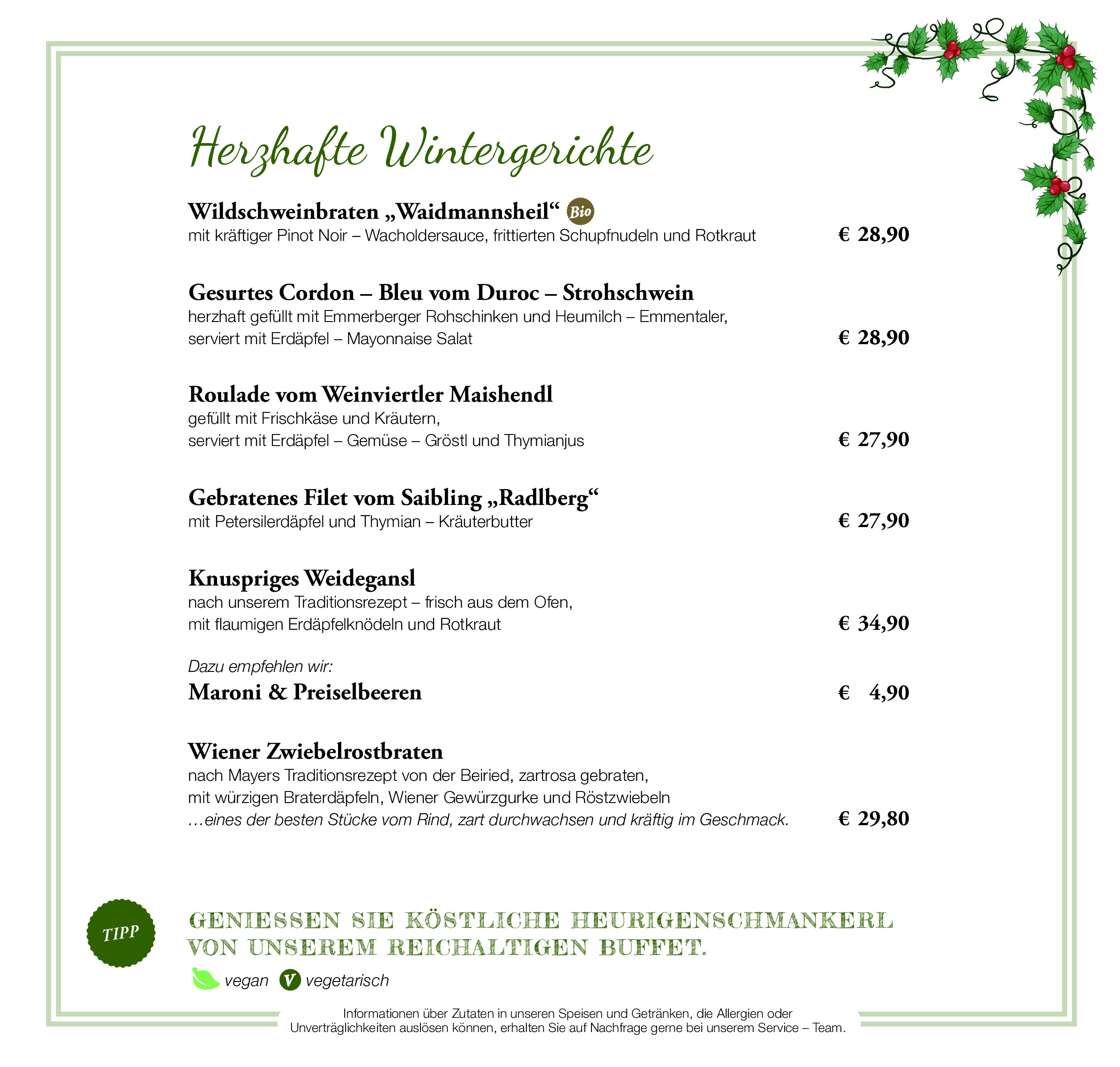 Der Winter kehrt ein beim Mayer am Pfarrplatz – und mit ihm herzhaft-wärmende Genüsse aus der saisonalen Küche. Regional, frisch und mit viel Sorgfalt zubereitet. Genießen Sie unsere winterlichen Spezialitäten in unserer stimmungsvollen, winterlichen Atmosphäre. Kommen Sie vorbei und kosten Sie den Zauber des Winters – wir freuen uns auf Ihren Besuch! ❄️🍷