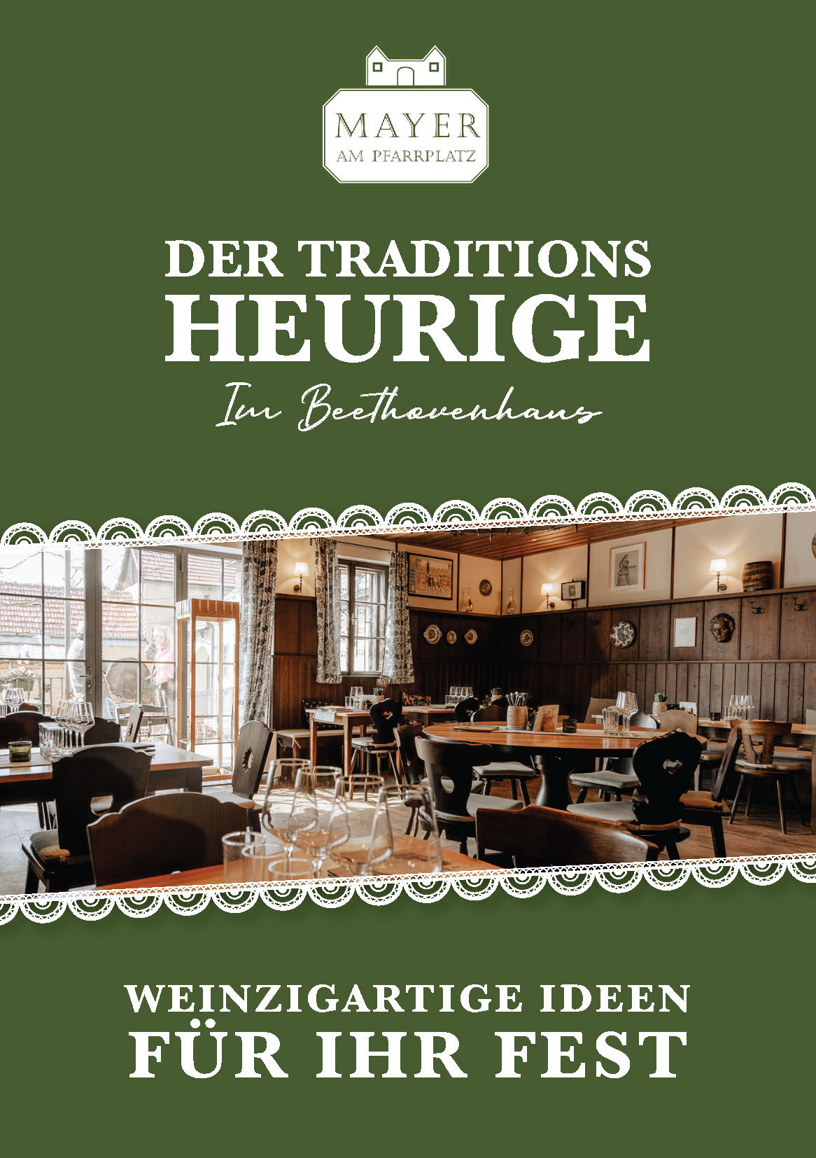 Un ambiente unico, le numerose possibilità offerte dalle sale elencate, le deliziose prelibatezze e il vino pluripremiato sono alcuni dei motivi per cui le feste all’Heuriger Mayer di Pfarrplatz sono un’esperienza indimenticabile. Che si tratti di matrimoni, feste private di ogni tipo, celebrazioni aziendali o feste di Natale, da noi troverete sicuramente la cornice giusta per il vostro evento.