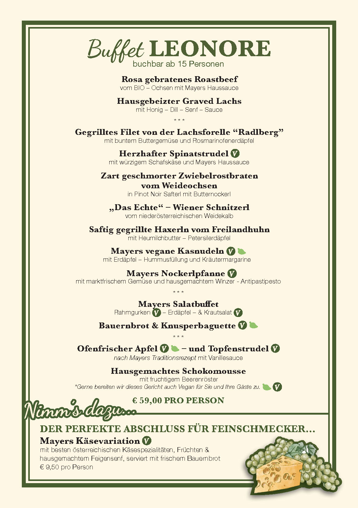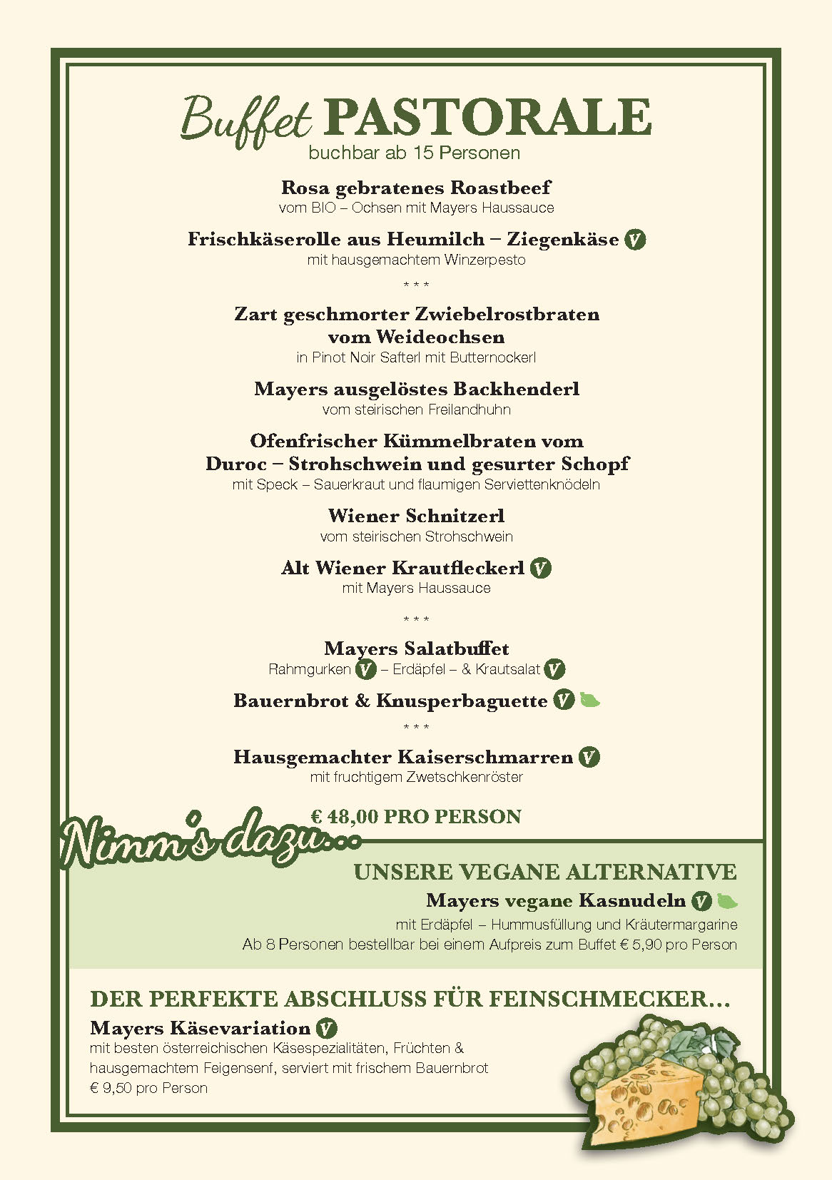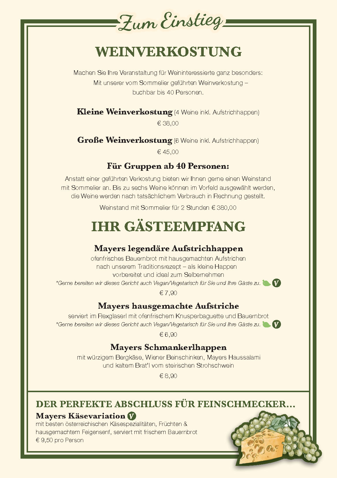 Concedete ai vostri ospiti una conclusione gustosa della serata con il piatto di formaggi Mayer, una variazione con formaggi selezionati e premiati dai nostri agricoltori austriaci, serviti con gelatina di Traminer fatta in casa e pasticcini freschi di forno: i vostri ospiti ne saranno entusiasti.