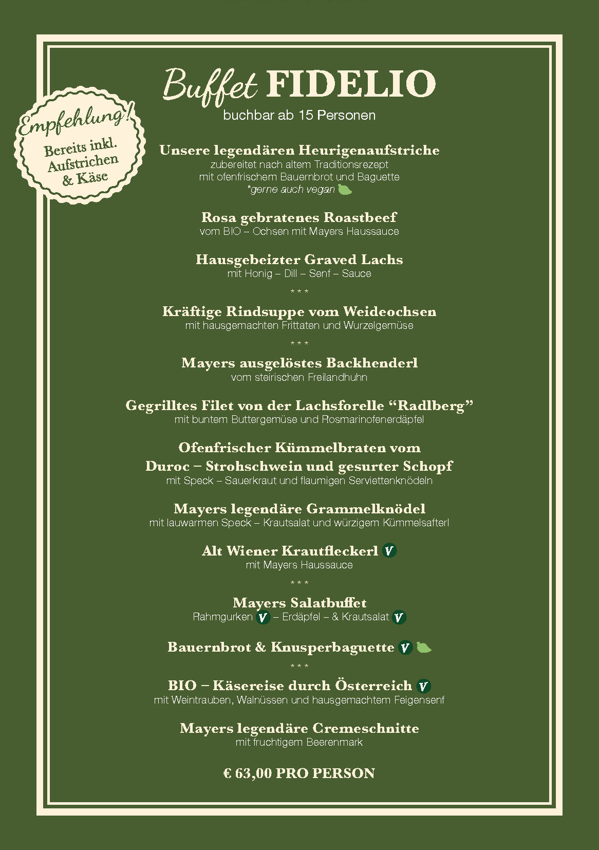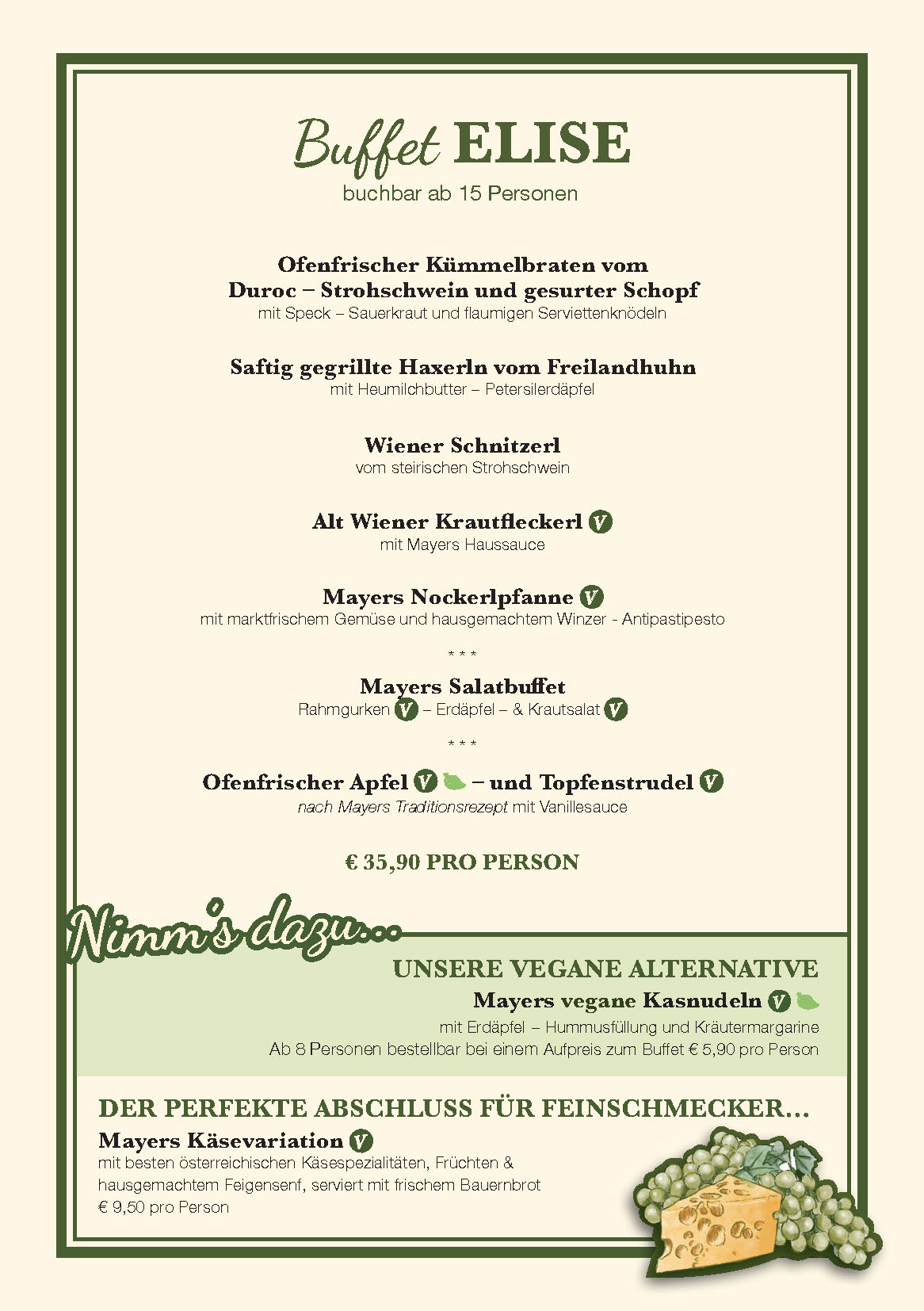 Un ricco buffet freddo e caldo con specialità stagionali e fatte in casa offre le tipiche prelibatezze viennesi e invita voi e i vostri ospiti a un allegro incontro con un ottimo bicchiere di vino. Dal succoso e croccante arrosto di maiale ai famosi Grammelknöderl e Alt Wiener Krautfleckerl di Mayer, c’è sicuramente un piatto per tutti i gusti. Per i vostri festeggiamenti a Mayer am Pfarrplatz, mettiamo a disposizione di voi e dei vostri ospiti una sala separata e prepariamo uno dei buffet da noi suggeriti o lavoriamo con voi per creare un buffet interamente secondo i vostri desideri.