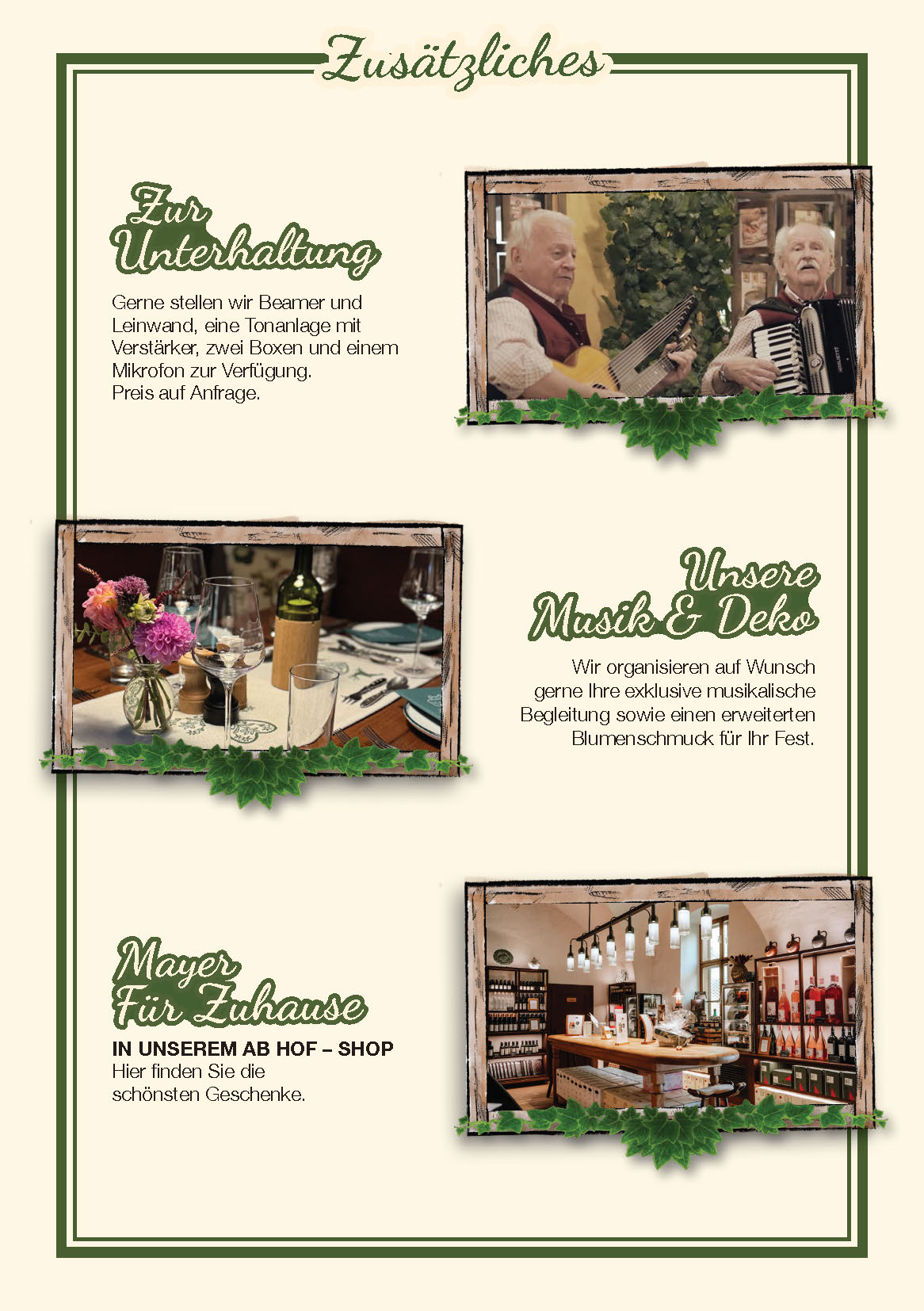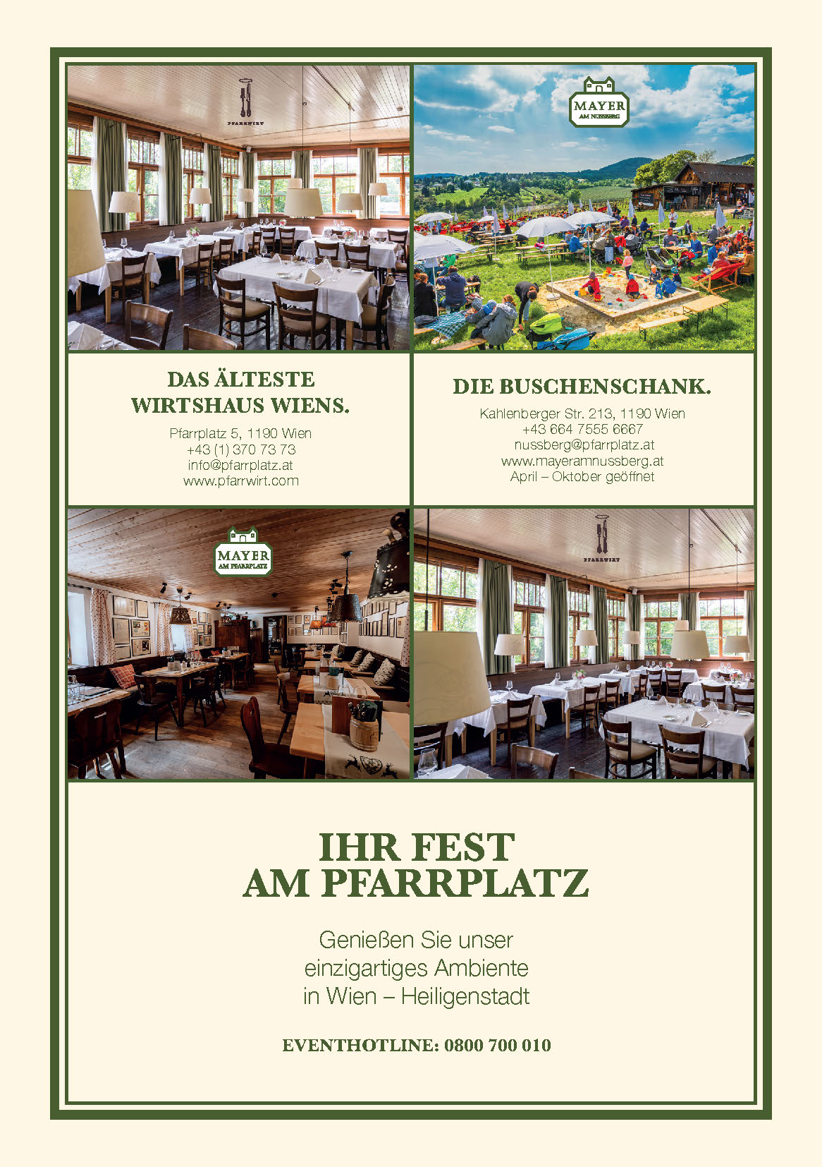 I nostri salotti di varie dimensioni vi permettono di organizzare una festa esclusiva per sole 10 persone, mentre per i gruppi più numerosi il nostro Heuriger offre spazio fino a 450 persone. Cucineremo per voi uno dei nostri buffet suggeriti o lavoreremo con voi per creare un buffet interamente secondo le vostre idee. Il nostro team di Mayer am Pfarrplatz è sempre a disposizione per l’organizzazione del vostro evento.