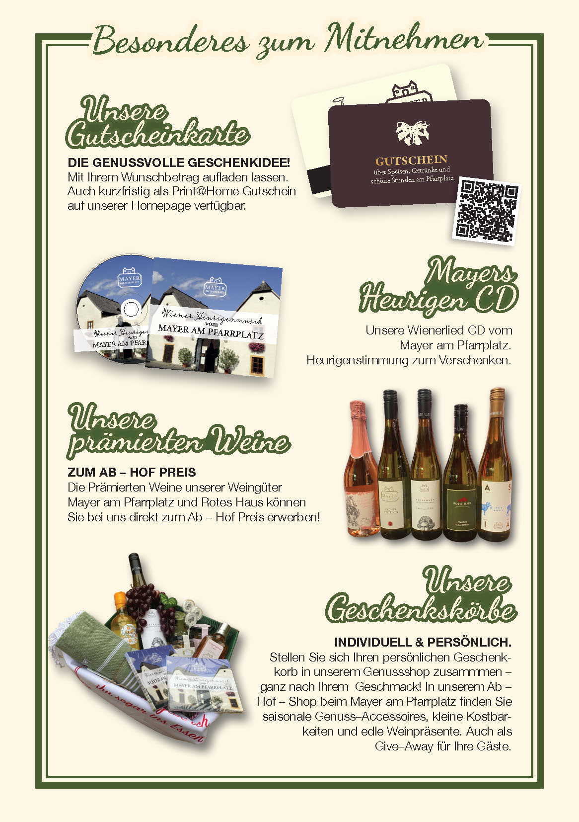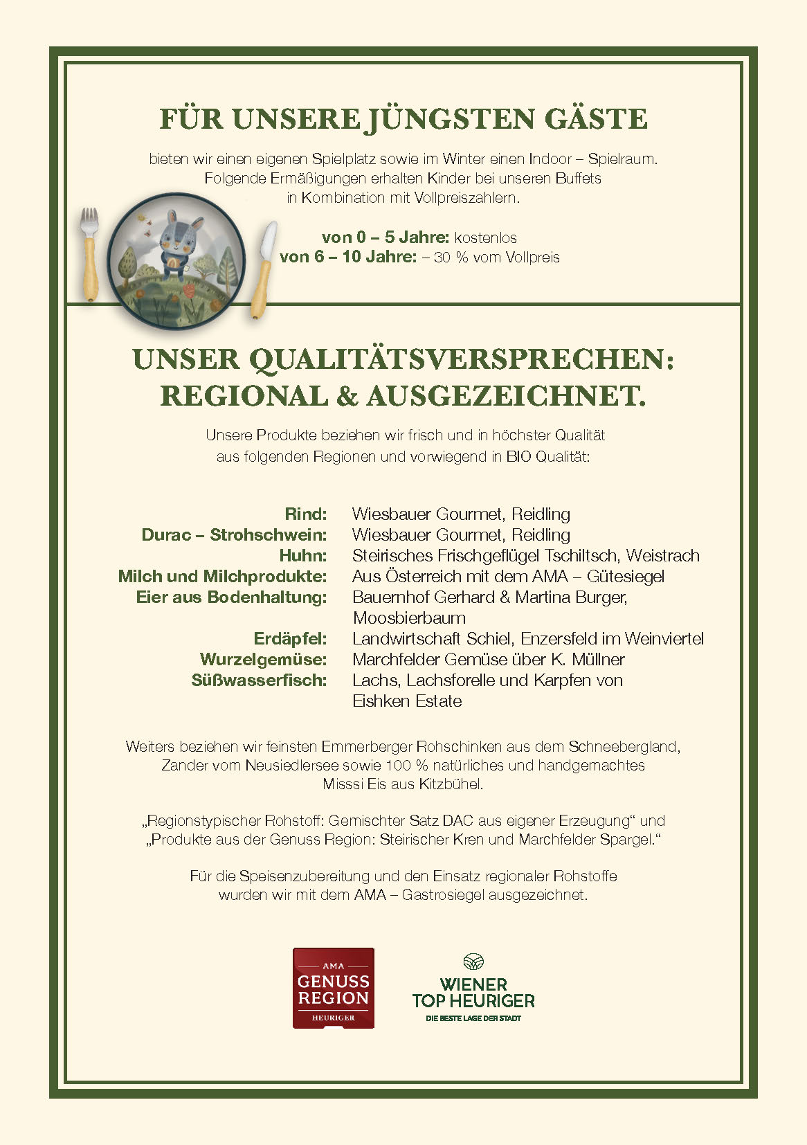 Qualità che si può gustare. Per le nostre prelibatezze utilizziamo prodotti provenienti dalle regioni limitrofe e dall’Austria. Questo non solo delizia i nostri ospiti, ma ha anche fatto guadagnare alla nostra taverna “Mayer am Pfarrplatz” il sigillo di approvazione AMA.