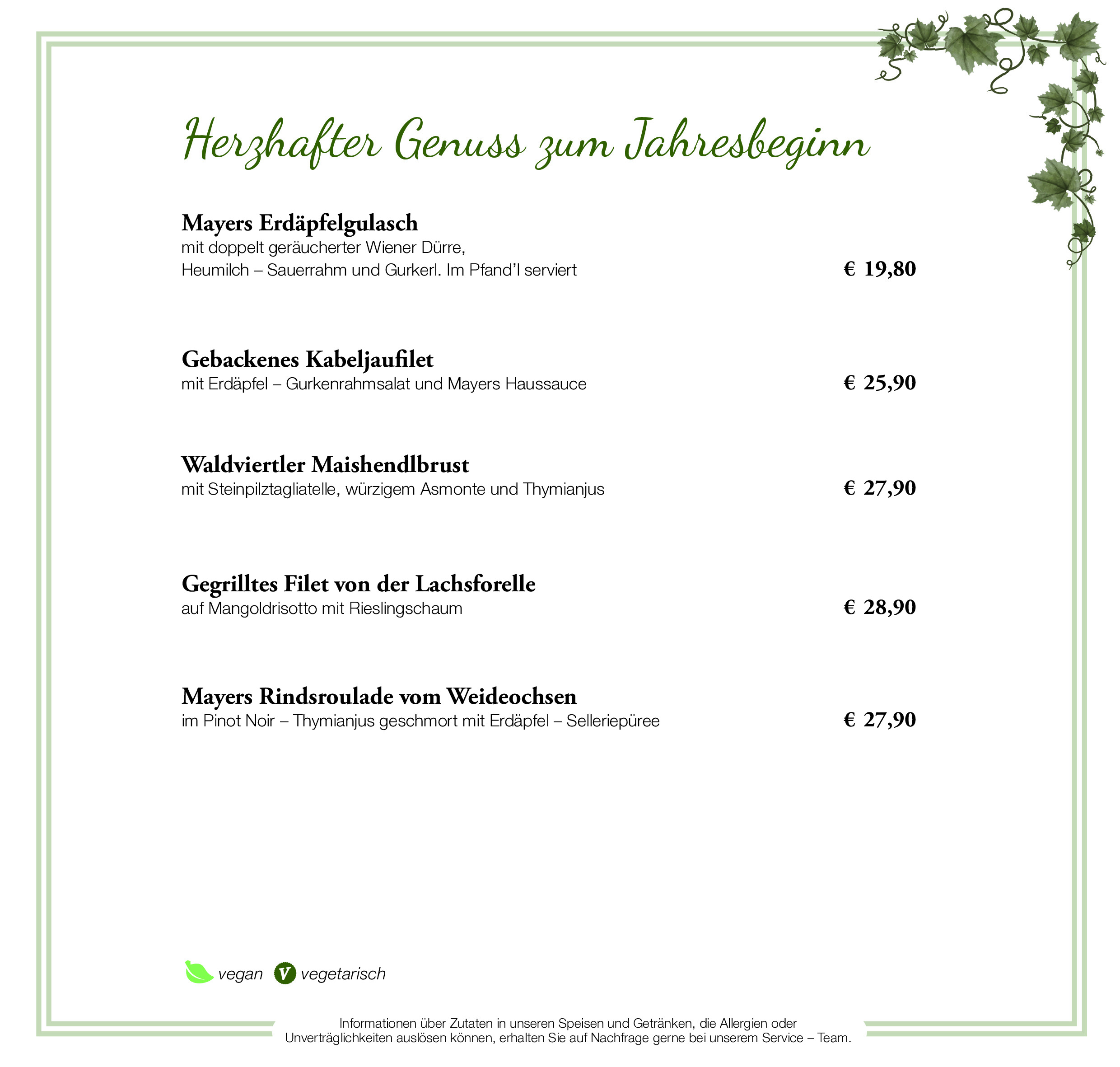 Der Jahresbeginn zeigt sich von seiner genussvollsten Seite: Freuen Sie sich auf wärmende Spezialitäten aus unserer saisonalen Küche – regional, frisch und mit viel Liebe zubereitet. In gemütlicher Atmosphäre laden wir Sie ein, das neue Jahr kulinarisch zu beginnen. Wir freuen uns auf Ihren Besuch. 🍷